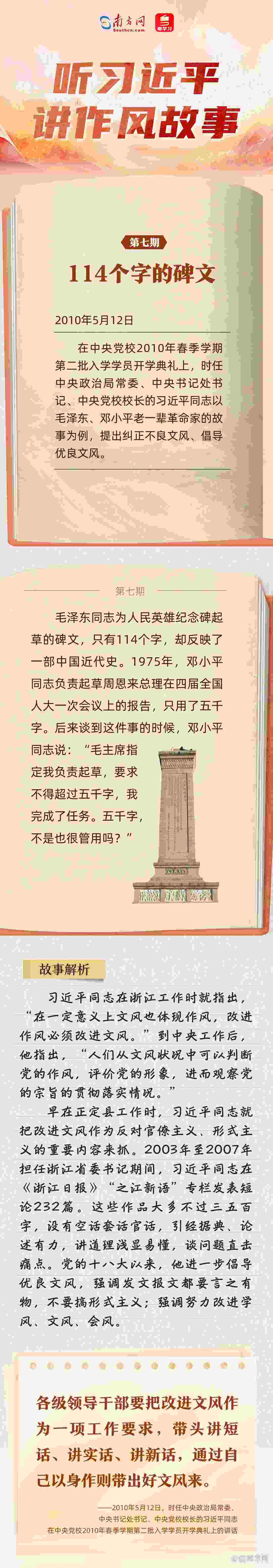 當前,全黨上下正在開展深入貫徹中央八項規(guī)定精神學習教育,縱深推進作風建設。關于作風建設,習近平總書記常用講故事的方式,傳達深意、感染他人,給人以思想啟迪。南方網(wǎng)、粵學習客戶端推出“聽習近平講作風故事”系列報道,與您一起感悟這些故事蘊含的深刻道理。 今天,推出《聽習近平講作風故事⑦丨114個字的碑文》,與您一起學習毛澤東、鄧小平老一輩革命家的文風。
