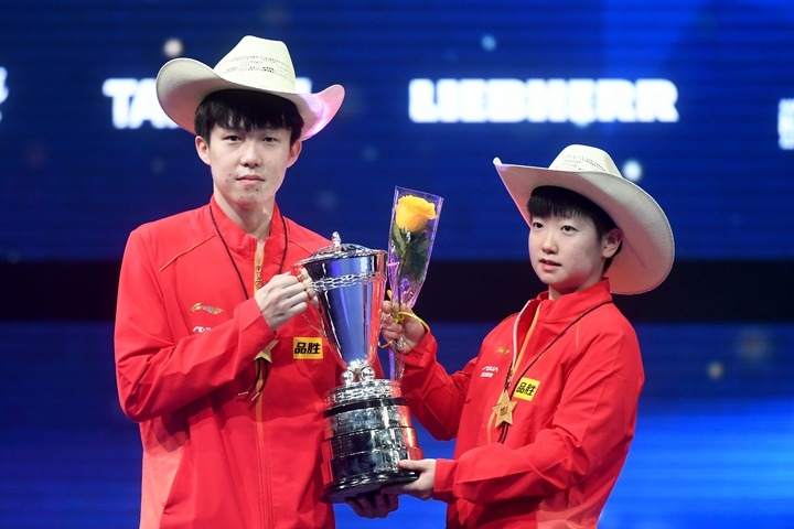 11月28日,孫穎莎(右)/王楚欽在混雙頒獎(jiǎng)儀式上手舉冠軍獎(jiǎng)杯合影。新華社記者 吳曉凌/攝