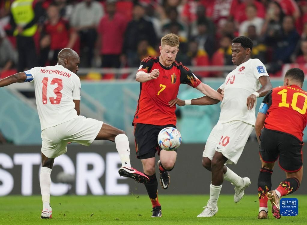 11月23日,比利時隊球員德布勞內(左二)在比賽中進攻。新華社記者 李鋼 攝