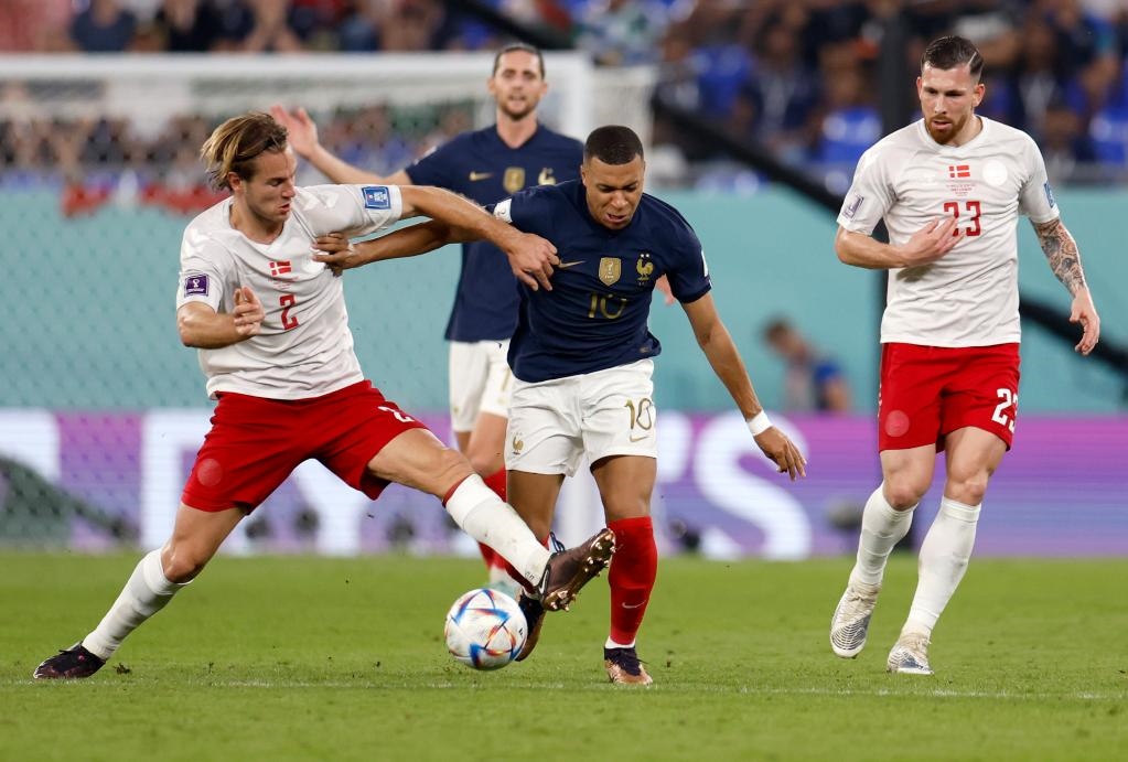 11月26日,丹麥隊球員約阿西姆-安德森(左一)和法國隊球員姆巴佩(右二)在比賽中拼搶。新華社記者 王麗莉 攝