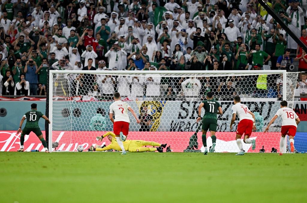 11月26日,沙特阿拉伯隊(duì)球員薩勒姆-達(dá)瓦薩里(左一)罰點(diǎn)球被波蘭隊(duì)守門員什琴斯尼撲出。新華社記者 辛悅衛(wèi) 攝