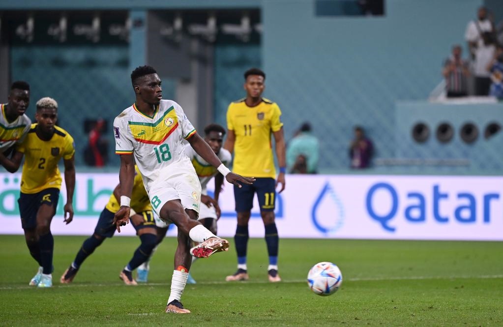 11月29日,塞內(nèi)加爾隊球員伊斯梅拉·薩爾(前)在比賽中主罰點球破門。新華社記者 陳誠 攝