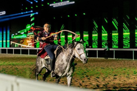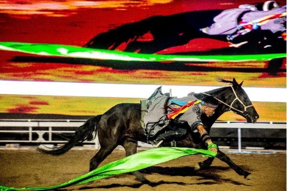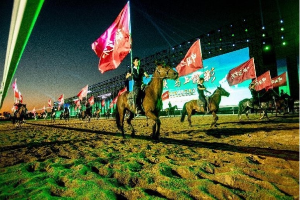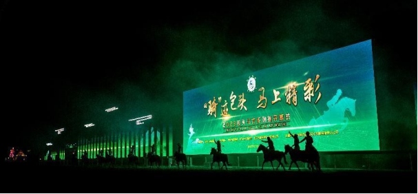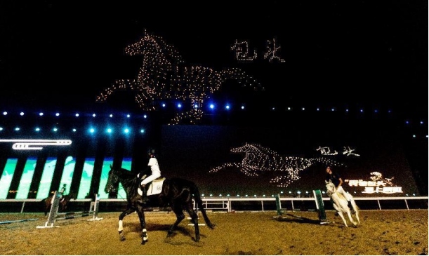 開幕式文體表演由《馬術(shù)方陣一馬當(dāng)先》、歌伴舞《我的城我的馬》、《名馬展示策馬揚鞭》、《單馬技巧雙翼神馬》、《馬障礙秀躍馬揚鞭》、《馬術(shù)秀人馬合一》、歌伴舞《騎跡包頭》、《無人機秀馬上精彩》八塊內(nèi)容組成。當(dāng)晚的賽汗塔拉馬術(shù)賽場流光溢彩、氣氛熱烈,場內(nèi)座無虛席、歡聲雷動。20時30分許,主騎手手持國旗,副騎手手持馬城旗幟,運動員方陣、民族方陣、女騎方陣、馬主方陣入場,騎手們精神飽滿、英姿颯爽,不時揮手致意,現(xiàn)場觀眾用熱烈的掌聲和歡呼聲,歡迎他們的到來。達茂旗9歲賽馬冠軍阿茹樂手持彩旗引出世界名馬亮相,40對人馬合一的“千古馬頌”表演震撼全場,1000架無人機躍然天空,點亮“騎跡包頭 馬上精彩”的字樣……藍天、碧水、凈土的包頭在策馬奔騰的馬術(shù)競技中拉開了“中國馬城”的壯麗畫卷。