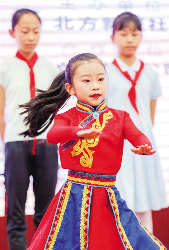 同樣來自騰飛路小學(xué)三年級5班的寧悅彤壓軸出場,在舞臺上激情四射的啦啦操表演獲得了很高的分?jǐn)?shù)。就在前一天,她和她的小伙伴們代表學(xué)校參加呼和浩特市第六屆中小學(xué)啦啦操健美操大賽,捧回了團(tuán)體第一的驕人成績。寧悅彤在后臺接受記者采訪時說:“第一次站上這樣大的舞臺表演,起初有點緊張,有幾個動作在表演過程中需要身體接觸地面,會很疼,但這是必須要承受的。我覺得這次經(jīng)歷也讓我更加勇敢,更加自信了?!?/p>
