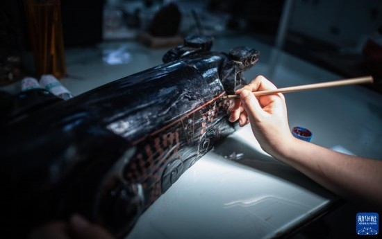 5月20日,在荊州文物保護(hù)中心,修復(fù)人員李寧修復(fù)一件戰(zhàn)國獸形酒具盒。