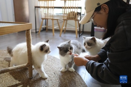 5月23日,在浙江省義烏市李祖村,貓咖“貓的小院”店長(zhǎng)在開店前給貓喂零食。