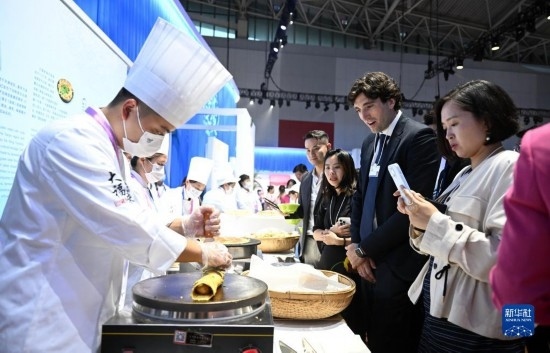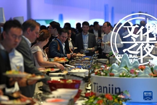 6月27日,與會(huì)嘉賓在第十四屆夏季達(dá)沃斯論壇文化之夜現(xiàn)場了解天津特色美食。