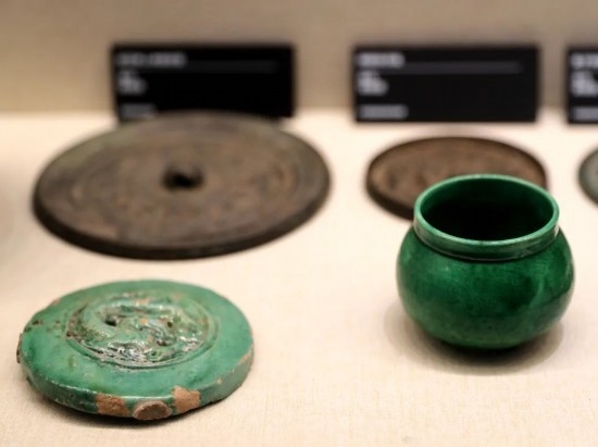 前排左:綠釉龍紋瓦當 金代 首都博物館藏;前排右:定窯綠釉矮領(lǐng)罐 金代 中國民族博物館藏。(民族畫報記者 鷹鴿 攝)