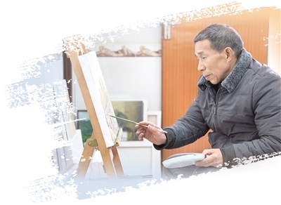 一手托著調(diào)色盤,一手舉著畫筆,眼前一個(gè)畫架,陳云發(fā)常常沉浸在自己的創(chuàng)作中。過(guò)去,陳云發(fā)以種田和做泥瓦工為生。藝術(shù)區(qū)建設(shè)期間,陳云發(fā)家中的幾間房子被張佰橋租來(lái)存放畫具。藝術(shù)家們創(chuàng)作時(shí),陳云發(fā)也在旁邊看。后來(lái),張佰橋送給陳云發(fā)一套畫具,“感興趣,就跟著學(xué)!”