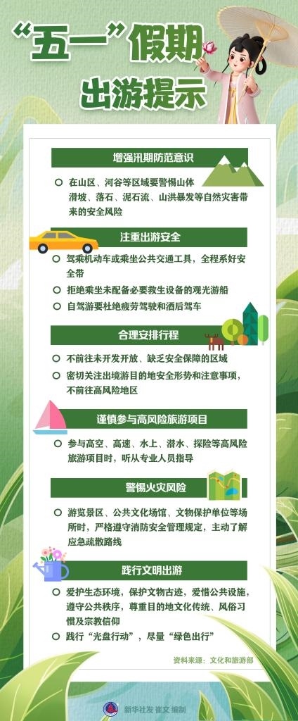 文化和旅游部建議,提前了解途經(jīng)地、目的地天氣、交通情況,關(guān)注旅游景區(qū)假期開放情況和門票預(yù)約措施,合理規(guī)劃旅游線路和時(shí)間。不前往未開發(fā)開放、缺乏安全保障的區(qū)域。密切關(guān)注出境游目的地安全形勢(shì)和注意事項(xiàng),不前往高風(fēng)險(xiǎn)地區(qū)。