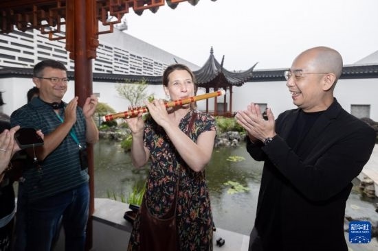 6月25日,柏林愛樂樂團的樂手在嘗試吹奏中國竹笛。