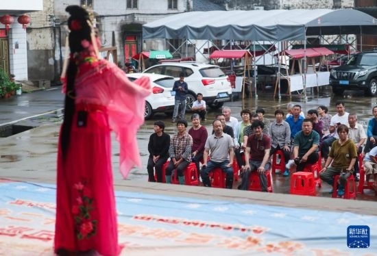 6月25日,澧浦鎮(zhèn)鄭店村百姓在觀看光南文化禮堂大舞臺上婺之靈坐唱班表演的婺?。o人機照片)。