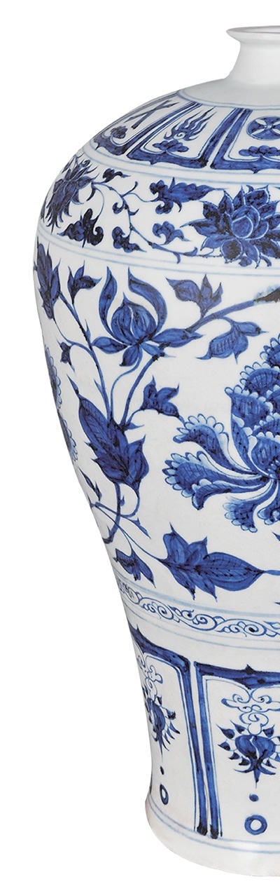 “元代的景德鎮(zhèn)制瓷匠從波斯進(jìn)口‘蘇麻離青’,也就是鈷藍(lán)料,經(jīng)高溫?zé)坪蟪尸F(xiàn)出了青花的典型色調(diào)?!别^長(zhǎng)彭國(guó)紅靠近展柜,指著梅瓶說(shuō)道:“青花料濃厚處有黑褐色鐵銹瑕疵,是因?yàn)檫@種原料中含有金屬元素,這是元代青花制品的特點(diǎn)之一。”