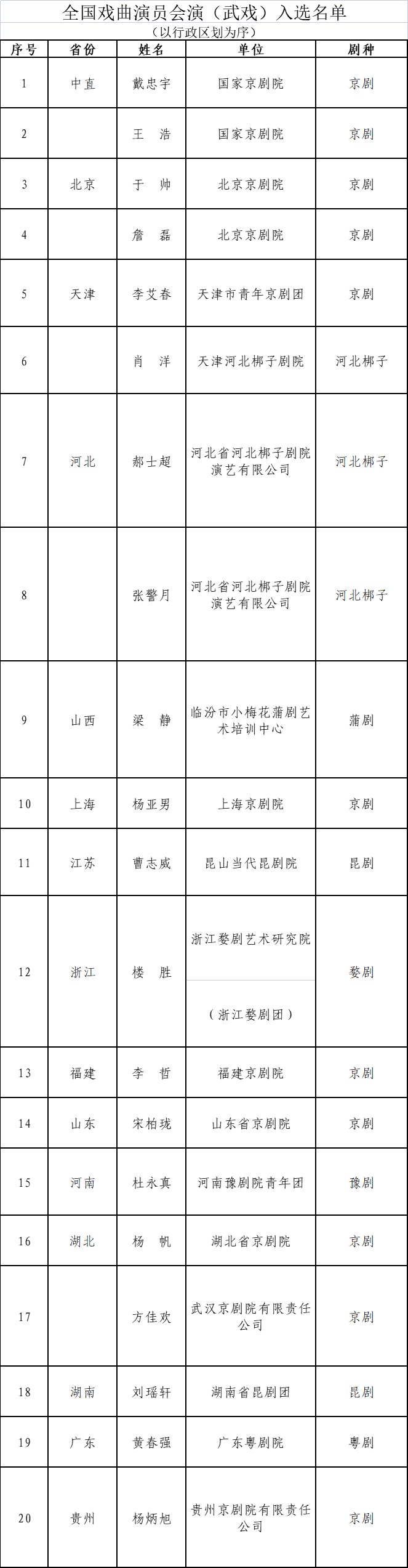 人民網(wǎng)北京3月25日電 (記者楊虞波羅)據(jù)文化和旅游部官網(wǎng)消息,日前,全國戲曲演員會演(武戲)遴選和公示工作已結(jié)束?,F(xiàn)將入選名單予以公布,并就有關(guān)事項函告如下。