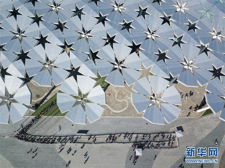 游客在北京世園會國際館前排隊參觀(10月7日無人機拍攝)。