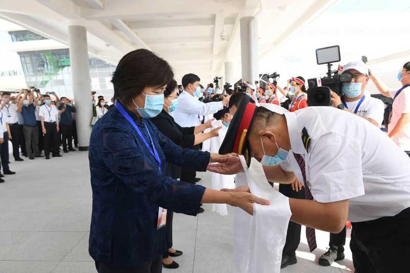 自治區(qū)黨委副書(shū)記、自治區(qū)主席布小林宣布赤喀高鐵正式開(kāi)通運(yùn)營(yíng),并與自治區(qū)副主席艾麗華、自治區(qū)政府秘書(shū)長(zhǎng)包振玉以及中國(guó)鐵路沈陽(yáng)局集團(tuán)有限公司、蒙遼鐵路客運(yùn)專(zhuān)線有限責(zé)任公司、赤峰市委負(fù)責(zé)同志一起為列車(chē)組人員敬獻(xiàn)哈達(dá)。