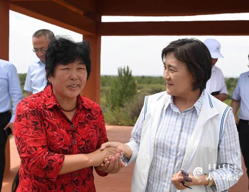烏蘭陶勒蓋治沙站位于烏審旗毛烏素沙地腹部,建站40多年來,以治沙造林、保護(hù)森林資源為己任,一代接著一代干,防沙治沙工作取得了明顯成效。布小林來到烏蘭陶勒蓋治沙站,調(diào)研治沙造林工作,并與全國(guó)“三八·綠色獎(jiǎng)?wù)隆鲍@得者殷玉珍親切交流,對(duì)當(dāng)?shù)厣鷳B(tài)治理的模式和成效給予肯定。她還來到伊金霍洛旗紅慶河鎮(zhèn),考察鄉(xiāng)村治理、消費(fèi)扶貧等工作。