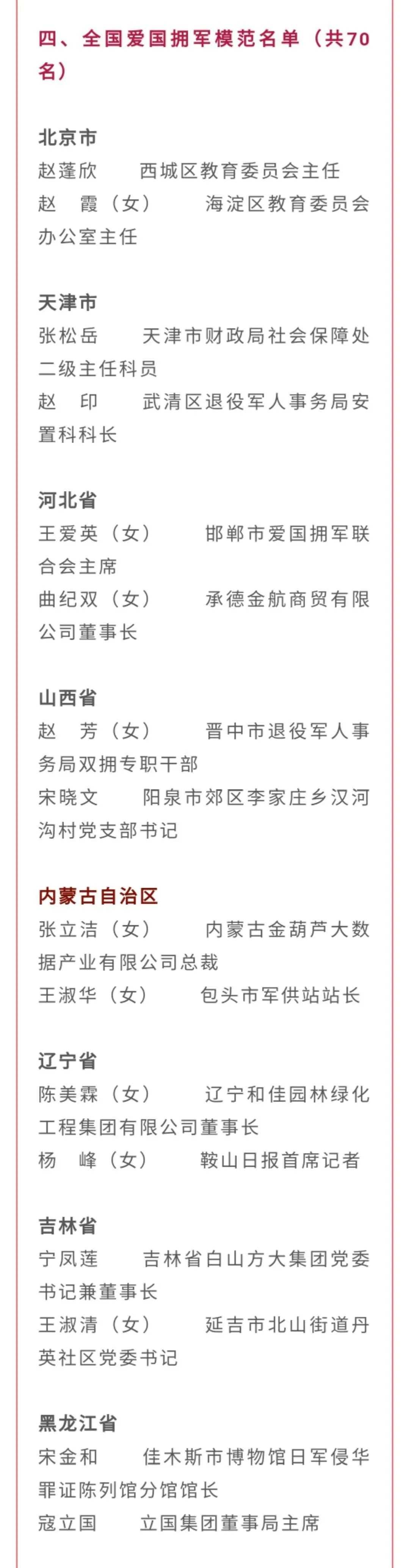 10月20日,全國雙擁模范城(縣)命名暨雙擁模范單位和個(gè)人表彰大會(huì)在北京舉行,大會(huì)宣讀了關(guān)于命名411個(gè)全國雙擁模范城(縣),關(guān)于表彰全國愛國擁軍模范單位和擁政愛民模范單位,關(guān)于表彰全國愛國擁軍模范和擁政愛民模范的決定。內(nèi)蒙古自治區(qū)13個(gè)市縣(旗)榮膺全國雙擁模范城(縣),1個(gè)鎮(zhèn)、2名全國愛國擁軍模范受到表彰。全部名單如下: