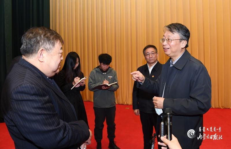 11月8日上午,在學(xué)習(xí)貫徹黨的十九屆五中全會(huì)精神中央宣講團(tuán)內(nèi)蒙古報(bào)告會(huì)結(jié)束后,聆聽(tīng)報(bào)告會(huì)的部分人員與宣講人沈春耀互動(dòng)交流。內(nèi)蒙古日?qǐng)?bào)記者 袁永紅 攝