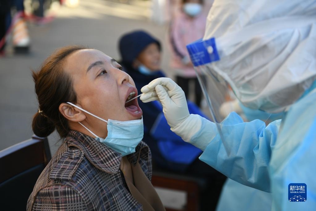 10月20日,在因疫情封控的阿拉善盟額濟納旗達來呼布鎮(zhèn)天賦佳苑小區(qū)內(nèi),醫(yī)務(wù)人員為居民進行核酸采樣。新華社記者 貝赫 攝