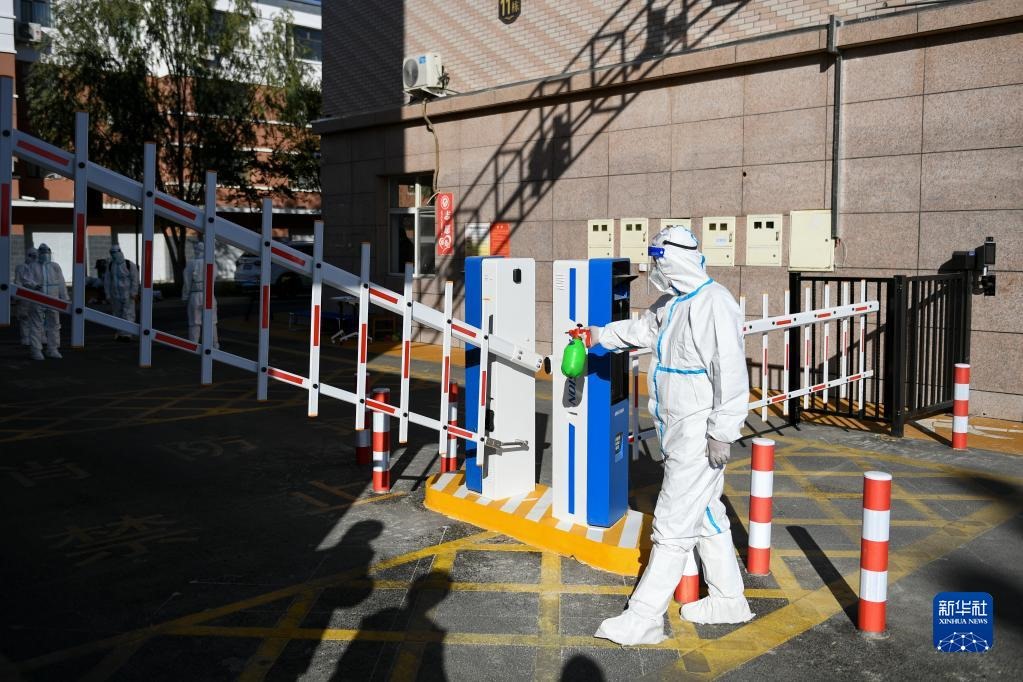10月20日,在因疫情封控的阿拉善盟額濟納旗達來呼布鎮(zhèn)團結(jié)小區(qū)內(nèi),社區(qū)工作人員進行消殺工作。