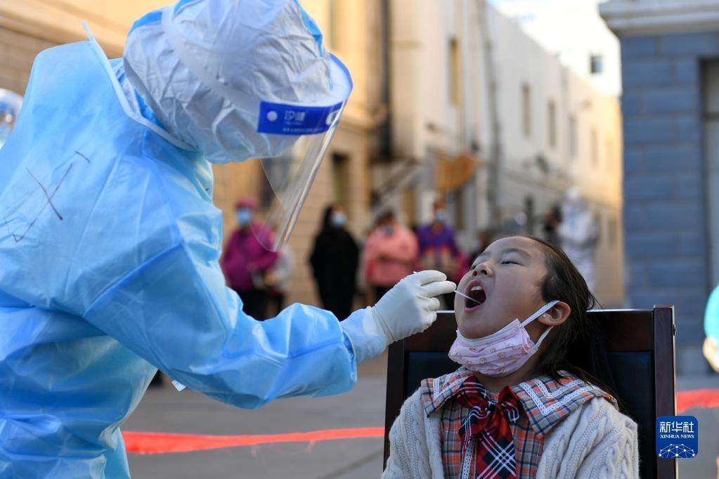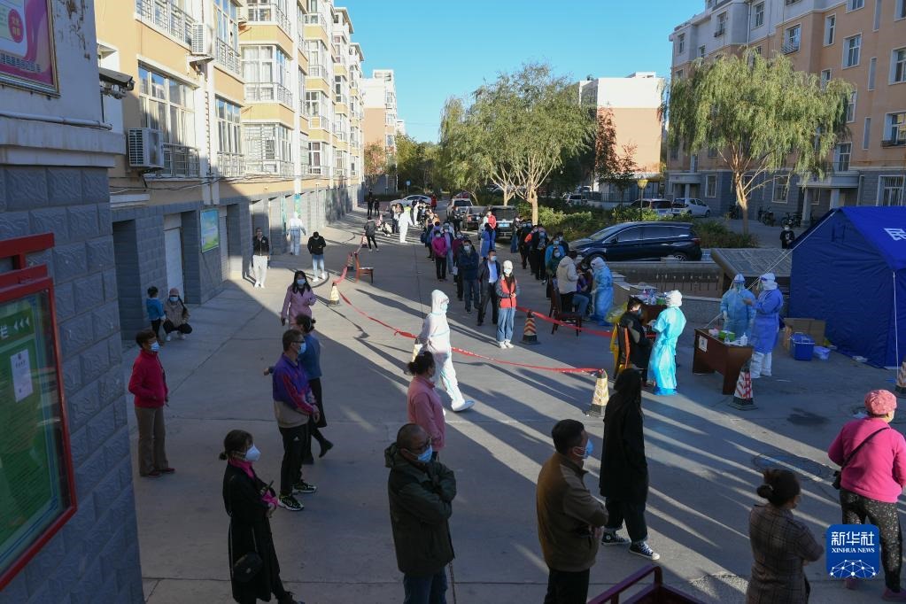 10月20日,在因疫情封控的阿拉善盟額濟納旗達來呼布鎮(zhèn)天賦佳苑小區(qū)內(nèi),核酸采樣工作有序開展。新華社記者 貝赫 攝