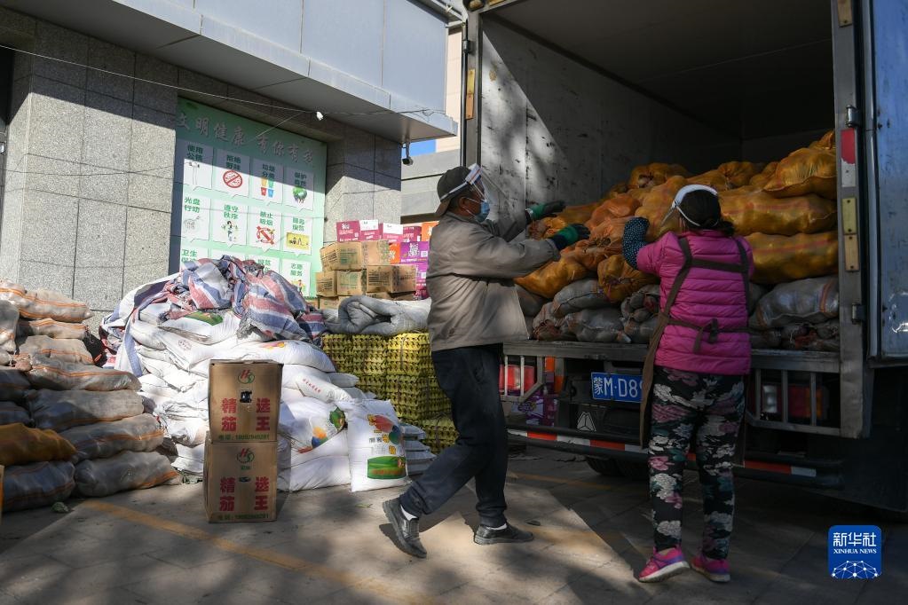 10月20日,在阿拉善盟額濟納旗達來呼布鎮(zhèn)民族生活超市外,超市員工在搬運物資。新華社記者 貝赫 攝