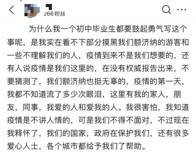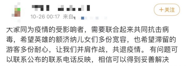 在社交媒體上,一名王姓女士通過短視頻呈現(xiàn)了一家人滯留額濟(jì)納的境況,在視頻中,她為同樣滯留在此的游客鼓勁:“如果你此時正在阿拉善,愿你如胡楊般堅強,積極應(yīng)對疫情?!边@條短視頻發(fā)出數(shù)小時,就吸引了20余萬瀏覽量?! ?/p>