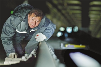 昏暗、逼仄的軌行區(qū)內(nèi),軌道檢修師們焊接鋼軌時迸發(fā)的火花顯得格外耀眼,維修軌道設(shè)備時敲擊鋼軌的聲音顯得格外清脆、響亮。據(jù)田智宏介紹,一個軌道檢修師每次夜間軌行區(qū)的巡檢作業(yè)大約要走7公里路程。他和工友們每天要檢查數(shù)千個部件,測量上百個數(shù)據(jù),其中一項重要巡檢工作就是檢查扣件和接頭聯(lián)結(jié)零件的組成部件是否安裝牢固,螺栓是否松動。他指了指自己腳上的鞋說:“我們的檢修對象不僅笨重且危險性較高,為了防止腳部受到傷害,鞋子都是特制的防砸絕緣鞋。”