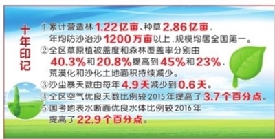 累計營造林1.22億畝、種草2.86億畝,年均防沙治沙1200萬畝以上,規(guī)模均居全國第一;全區(qū)草原植被蓋度和森林覆蓋率分別由40.3%和20.8%提高到45%和23%,荒漠化和沙化土地面積持續(xù)減少;全區(qū)空氣優(yōu)良天數(shù)比例較2015年提高3.7個百分點,國考地表水斷面優(yōu)良水體比例較2016年提高22.9個百分點……