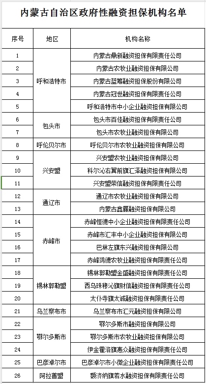 內(nèi)蒙古公布26家政府性融資擔(dān)保機(jī)構(gòu)
