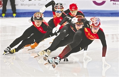 2月17日,吉林隊(duì)選手孫龍(右)在短道速滑公開組男子500米決賽中領(lǐng)滑。當(dāng)日,在“十四冬”短道速滑公開組500米比賽中,吉林隊(duì)選手孫龍、張楚桐將男子、女子500米項(xiàng)目?jī)擅督鹋剖杖肽抑小2菰健ふ狈骄W(wǎng)記者 孟和朝魯 攝