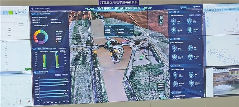 在河套灌區(qū)水量信息化監(jiān)測中心50米長的數(shù)字屏幕上,“數(shù)字總干渠”灌溉運(yùn)行決策支持系統(tǒng)只是其中一項內(nèi)容,在這個數(shù)字屏幕上,還能看到黃河三盛公水利樞紐工程的實時畫面、河套灌區(qū)渠溝道樞紐工程實時運(yùn)行現(xiàn)狀、總干渠5座樞紐工程運(yùn)行情況視頻、河套灌區(qū)水量調(diào)度系統(tǒng)、內(nèi)蒙古黃河實時視頻監(jiān)控等各種實時監(jiān)控畫面和實時數(shù)據(jù),先進(jìn)的科技讓人震撼。