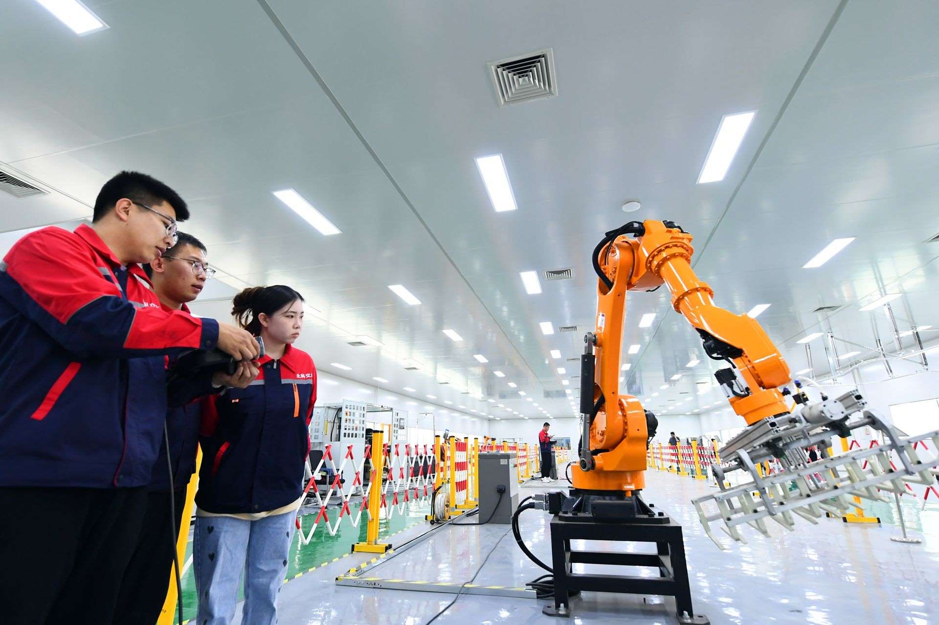 包頭稀土高新技術(shù)產(chǎn)業(yè)開發(fā)區(qū)高新技術(shù)特色產(chǎn)業(yè)基地北科交大機器人展廳,工作人員正在調(diào)試碼垛轉(zhuǎn)運六軸機器人。草原全媒記者金泉攝