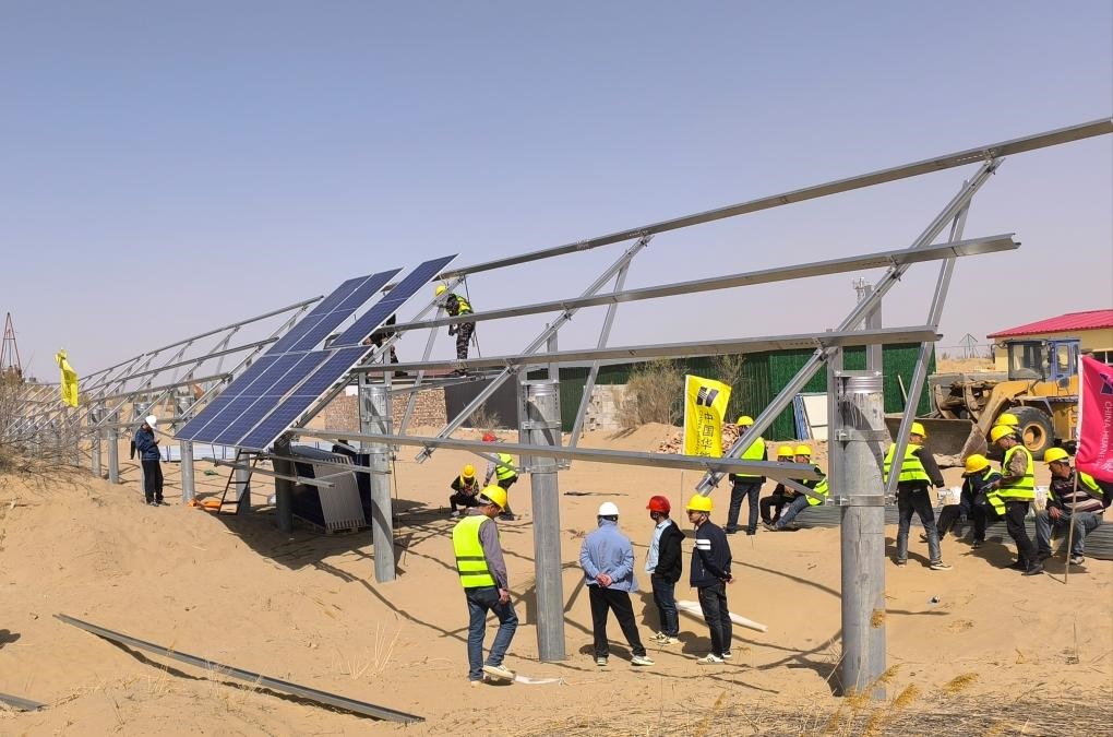 記者在新華林場(chǎng)民樂(lè)作業(yè)區(qū)看到,與其他作業(yè)區(qū)的造林治沙方式相比,這里既沒(méi)有栽樹,也沒(méi)有種草,而是在沙地里“栽”下了一個(gè)個(gè)水泥樁。葛文斌告訴記者:“這里是防沙治沙和風(fēng)電光伏一體化工程項(xiàng)目區(qū)。‘栽’水泥樁就是為后期安裝光伏板、建設(shè)光伏電站做準(zhǔn)備。在光伏板上發(fā)電的同時(shí),我們還可以在光伏板下種植固沙植物,幫助地表植被恢復(fù),達(dá)到既能發(fā)電‘生金’又能實(shí)現(xiàn)沙化土地縮減的雙重功效?!保ㄓ浾呃钤破健⒑罹S軼)