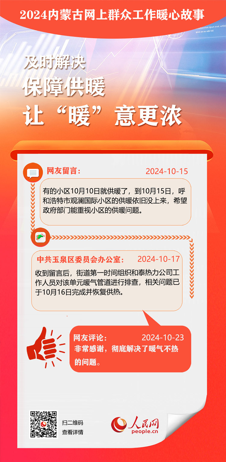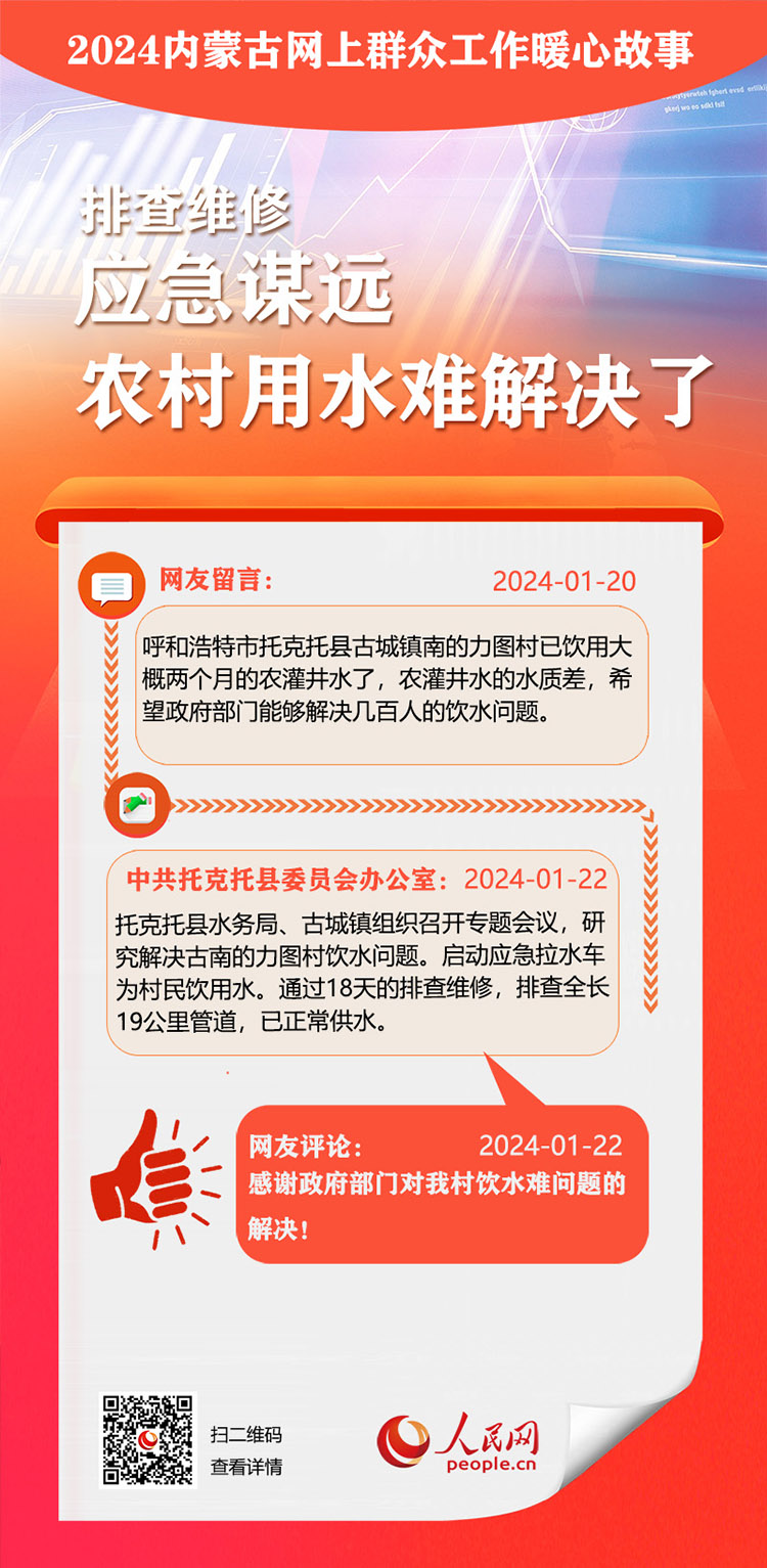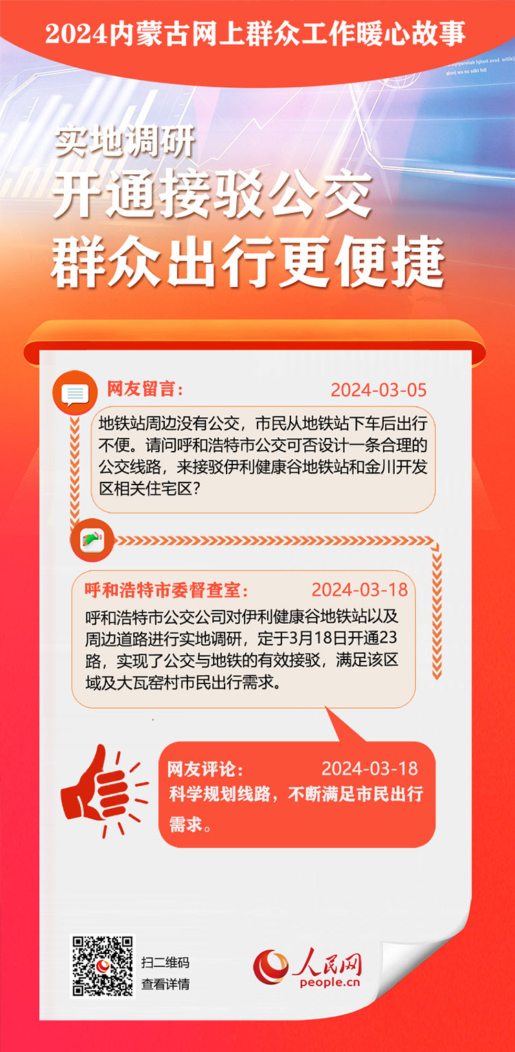 走好走實網(wǎng)上群眾路線 用心用情為民服務(wù)辦實事。依托人民網(wǎng)“領(lǐng)導(dǎo)留言板”,內(nèi)蒙古自治區(qū)各級黨委、政府著力解決網(wǎng)民反映的熱點難點。2024年,一批群眾關(guān)切的急難愁盼問題得到及時解決。人民網(wǎng)內(nèi)蒙古頻道推出特別策劃,盤點過去一年內(nèi)蒙古網(wǎng)上群眾工作那些暖心事?!?/p>