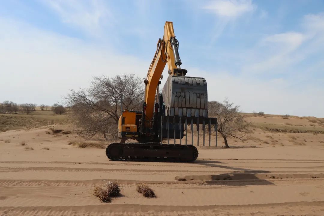 據(jù)錫林浩特市二蛋牧民養(yǎng)殖專業(yè)合作社負(fù)責(zé)人介紹,在傳統(tǒng)的沙漠治理作業(yè)中,工人需要手動(dòng)栽植黃柳等固沙植物。然而,人工種植不僅效率低,勞動(dòng)強(qiáng)度也大。為突破這一困境,合作社成員經(jīng)過多次試驗(yàn),最終決定對(duì)挖掘機(jī)進(jìn)行創(chuàng)新改造,加裝叉具,這一巧妙的設(shè)計(jì)不僅實(shí)現(xiàn)了對(duì)黃柳種植深度和間距的精準(zhǔn)把控,還能有效避免土壤翻動(dòng),最大程度地保持了土壤水分,切實(shí)保護(hù)了沙地的生態(tài)環(huán)境?! ?/p>