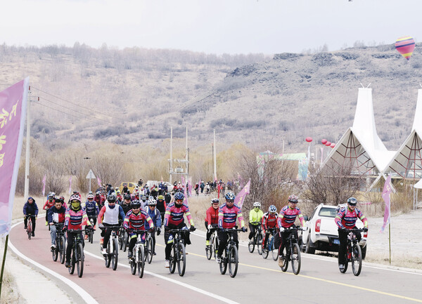 5月19日,在內蒙古自治區(qū)興安盟阿爾山市奧倫布坎景區(qū),游客們參加騎行活動。