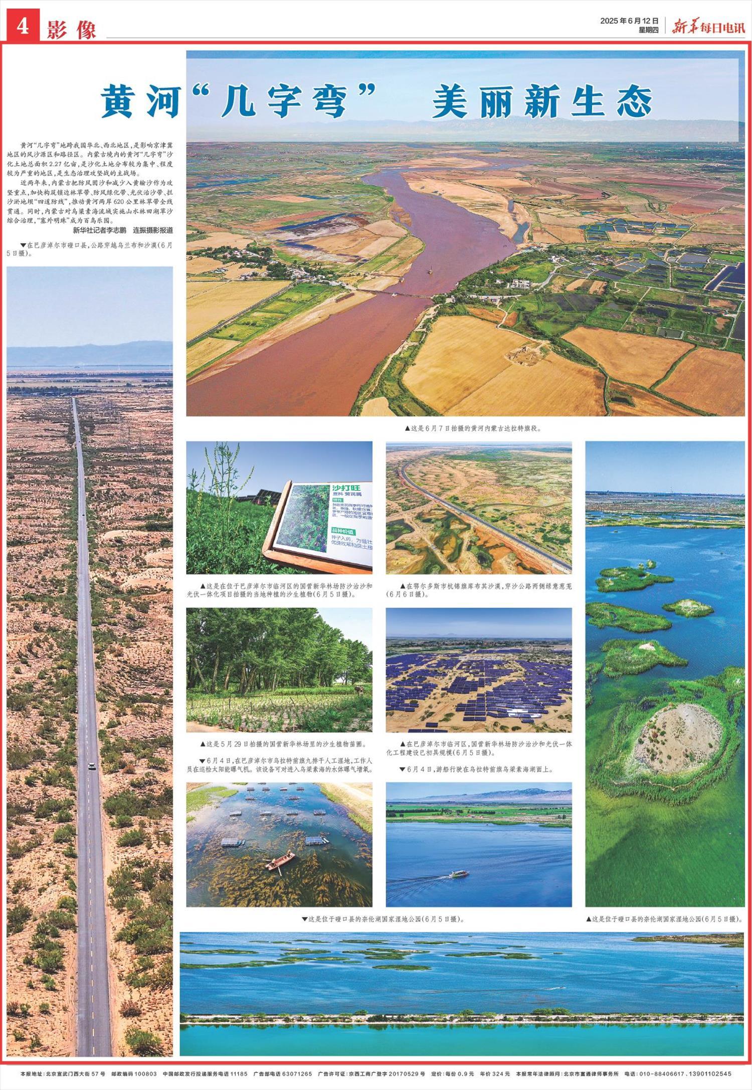 2025年6月12日,《新華每日電訊》第4版刊發(fā)題為《黃河“幾字彎” 美麗新生態(tài)》一文,報道了黃河“幾字彎”地跨我國華北、西北地區(qū),是影響京津冀地區(qū)的風沙源區(qū)和路徑區(qū)。內(nèi)蒙古加快構(gòu)筑鎖邊林草帶、防風綠化帶、光伏治沙帶、攔沙淤地壩“四道防線”,推動黃河兩岸620公里林草帶全線貫通。