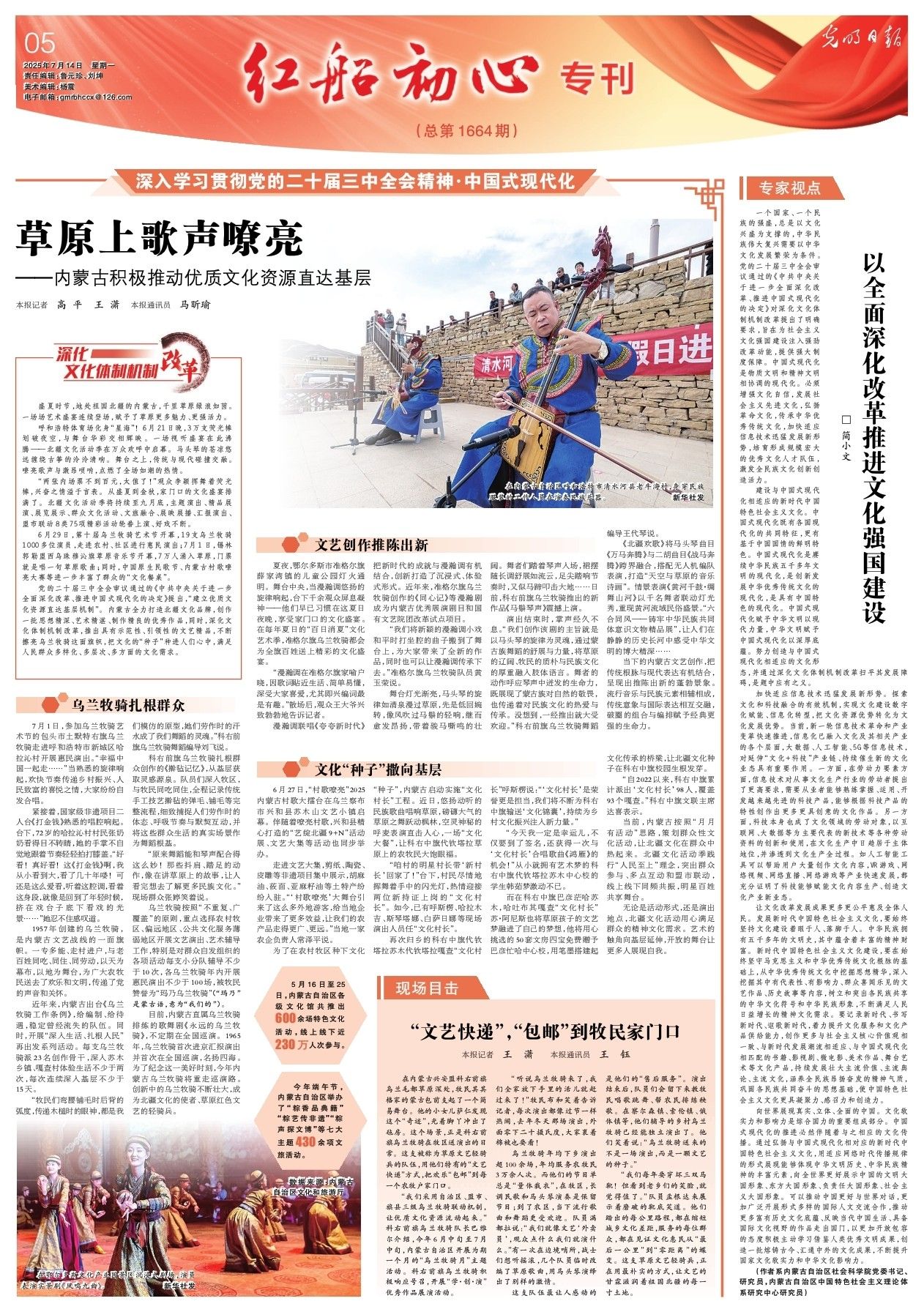 2025年7月14日,《光明日報(bào)》第5版刊發(fā)題為《草原上歌聲嘹亮——內(nèi)蒙古積極推動(dòng)優(yōu)質(zhì)文化資源直達(dá)基層》的文章,報(bào)道了盛夏時(shí)節(jié),地處祖國北疆的內(nèi)蒙古,千里草原綠浪如茵。一場場藝術(shù)盛宴連續(xù)登場,賦予了草原更多魅力、更強(qiáng)活力。