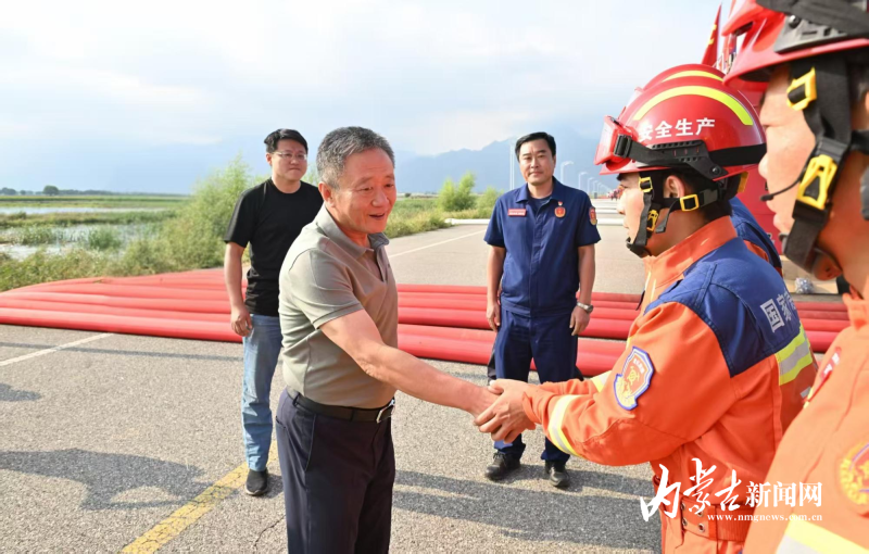 8月23日,自治區(qū)黨委書記孫紹騁在哈素海強(qiáng)排區(qū)沿著堤壩逐一看望連日?qǐng)?jiān)守崗位的應(yīng)急救援人員。草原云·內(nèi)蒙古新聞網(wǎng)記者 馬建兵 攝