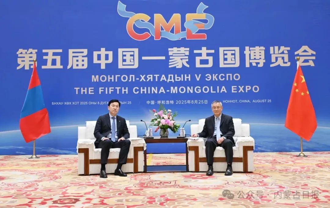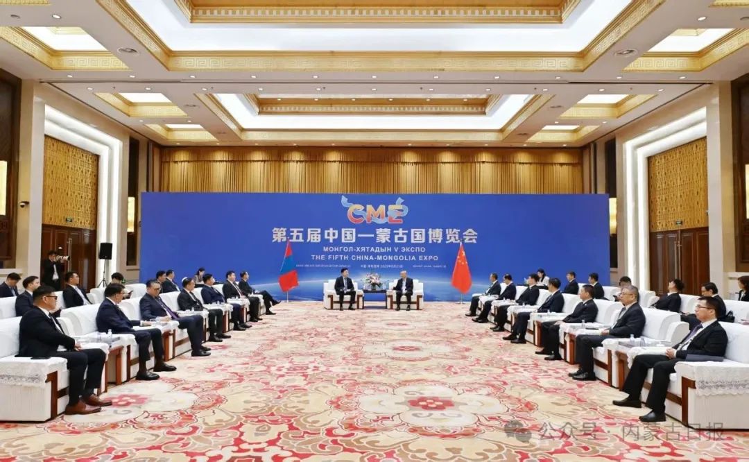 8月24日,全國人大常委會副委員長、民進中央主席蔡達(dá)峰在呼和浩特會見前來出席第五屆中國—蒙古國博覽會的蒙古國第一副總理兼經(jīng)濟發(fā)展部部長烏其爾勒一行。自治區(qū)黨委書記孫紹騁參加會見。草原云·內(nèi)蒙古新聞網(wǎng)記者 馬建兵 攝
