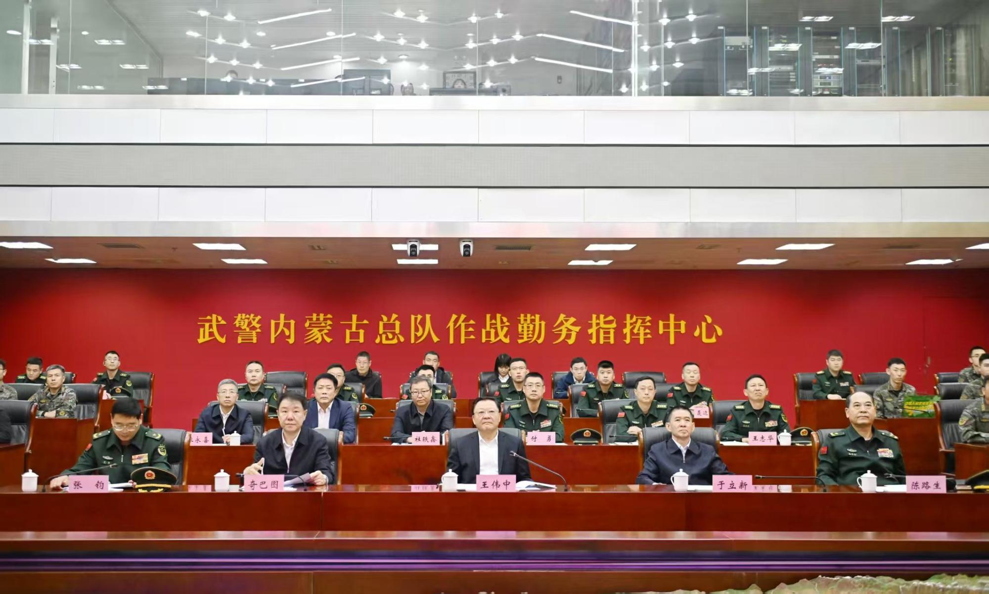 10月11日上午,自治區(qū)黨委書(shū)記王偉中來(lái)到武警內(nèi)蒙古總隊(duì),走進(jìn)作戰(zhàn)勤務(wù)指揮中心,仔細(xì)聽(tīng)取部隊(duì)建設(shè)和指揮中心運(yùn)行情況介紹。草原云·內(nèi)蒙古新聞網(wǎng)記者 馬建兵 攝
