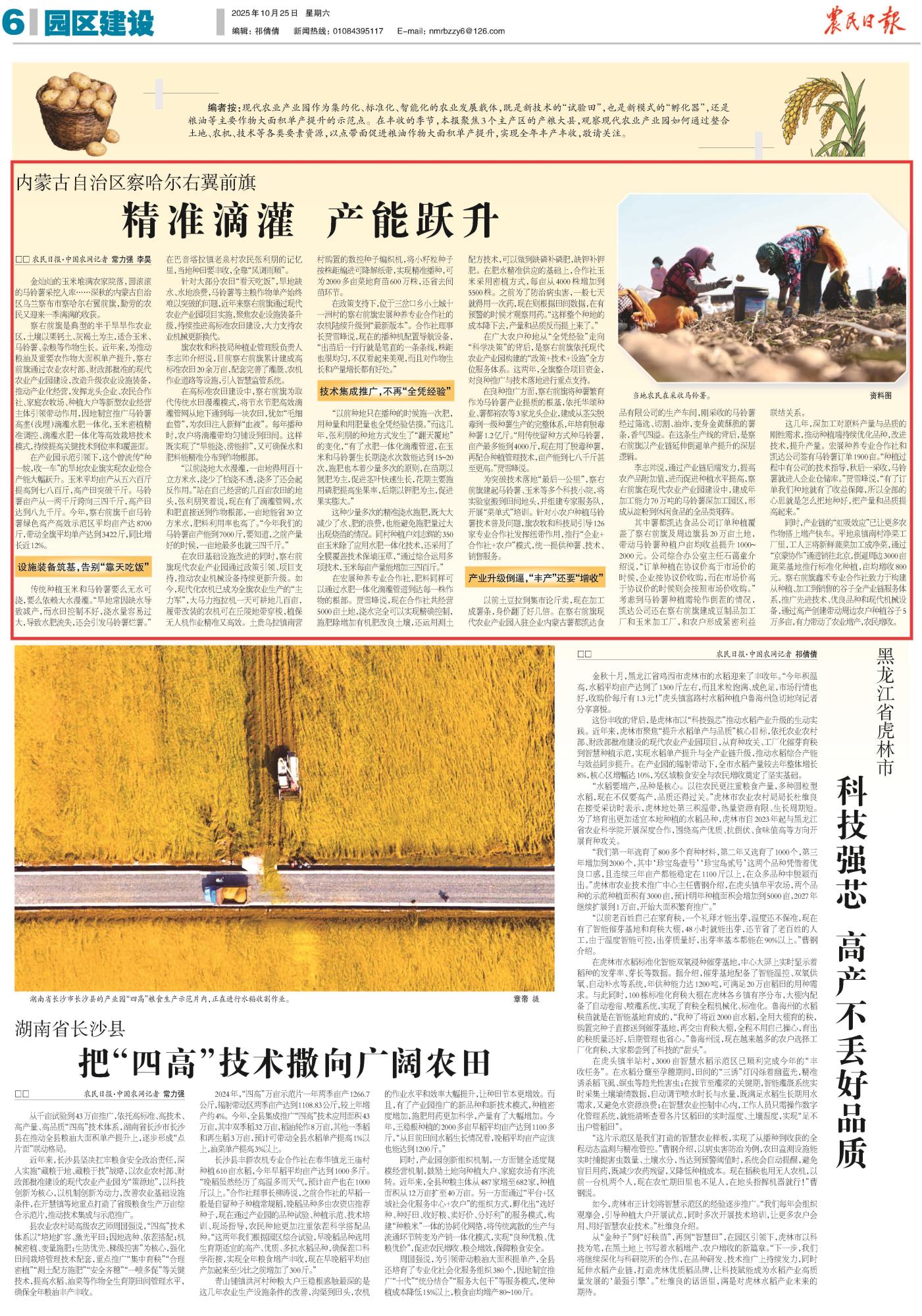 2025年10月25日,《農(nóng)民日報》第6版刊發(fā)題為《內(nèi)蒙古自治區(qū)察哈爾右翼前旗:精準滴灌 產(chǎn)能躍升》的文章,報道了內(nèi)蒙古烏蘭察布市察哈爾右翼前旗通過現(xiàn)代農(nóng)業(yè)產(chǎn)業(yè)園推廣滴灌水肥一體化等技術,推動玉米、馬鈴薯單產(chǎn)大幅提升,成功實現(xiàn)從“靠天吃飯”到科技增收的轉(zhuǎn)變。