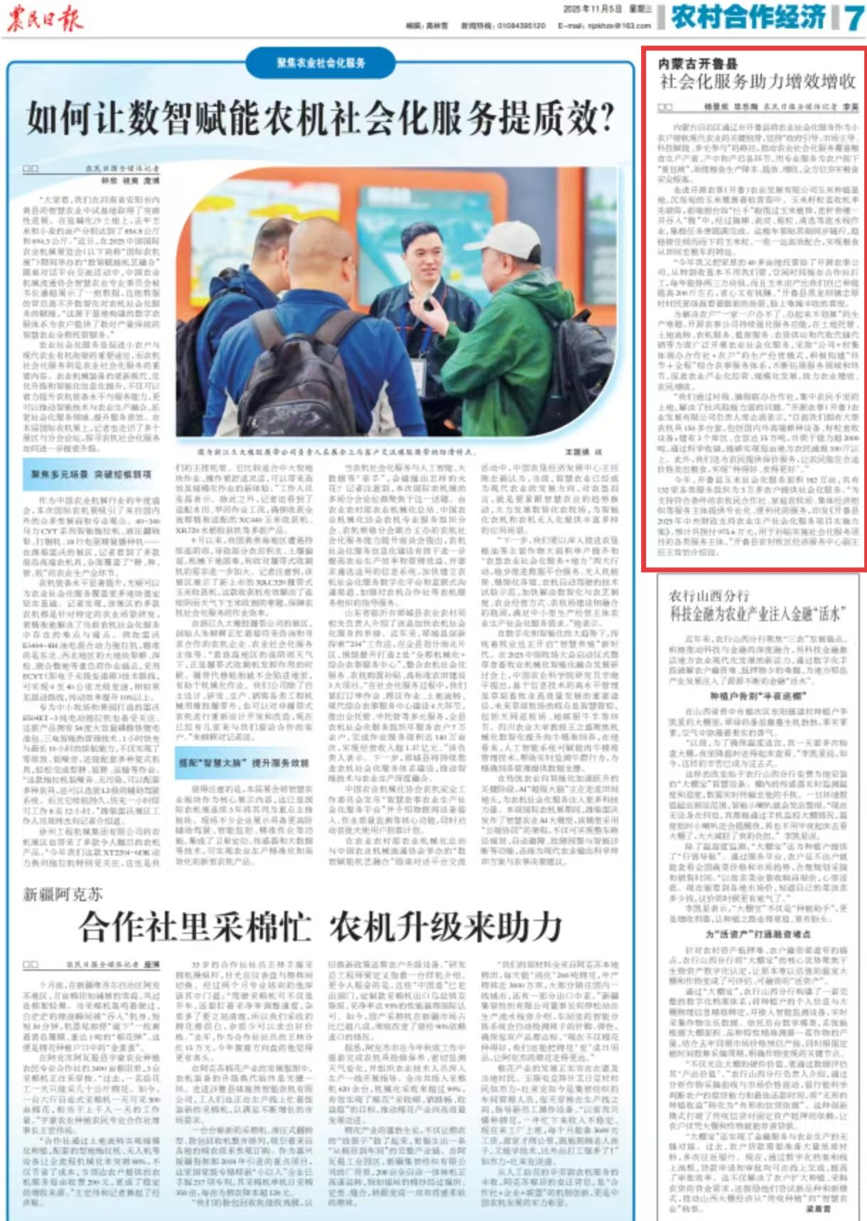 2025年11月5日,《農(nóng)民日報》第7版刊發(fā)題為《內(nèi)蒙古開魯縣:社會化服務助力增效增收》的文章,報道了今年以來,內(nèi)蒙古開魯縣玉米社會化服務面積182萬畝,共有132家各類服務組織為3萬多農(nóng)戶提供社會化服務。