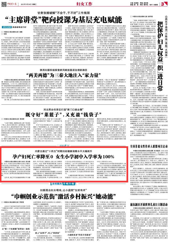 2025年11月18日《中國婦女報》第3版刊發(fā)了《內蒙古通遼“十四五”時期婦幼健康保障水平大幅躍升 孕產(chǎn)婦死亡率降至0 女生小學初中入學率為100%》的文章,報道了近年來,通遼市婦幼健康保障水平大幅躍升,孕產(chǎn)婦死亡率降至0,嬰兒死亡率降至2.28‰。婦女“兩癌”篩查成效顯著,完成50萬人次免費篩查,1461名低收入患病婦女獲得全額救助。聯(lián)合醫(yī)療部門開展的講座和義診惠及10萬余名婦女群眾。
