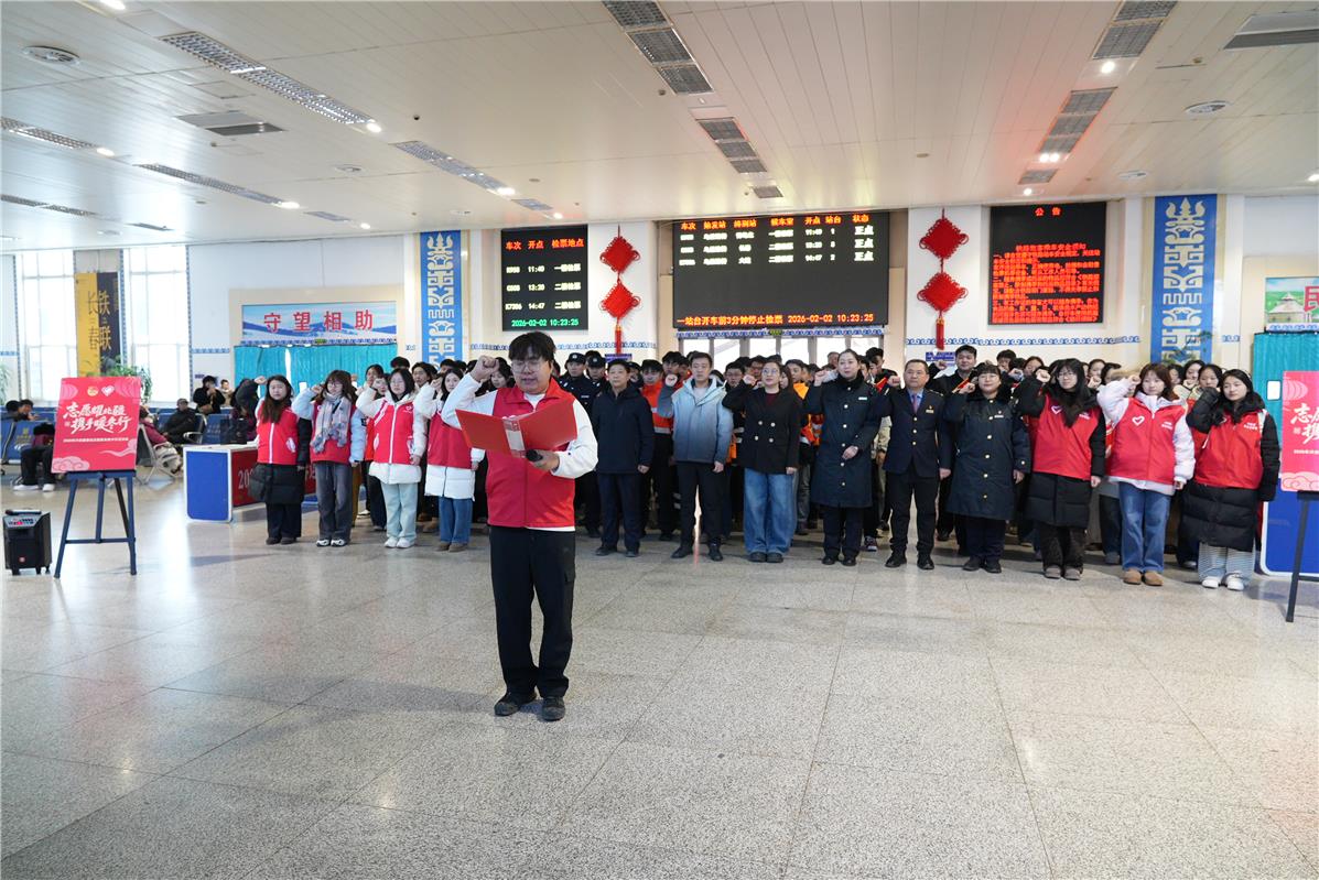 杜鐵毅在“志愿耀北疆,攜手暖冬行”興安盟春運志愿服務(wù)集中示范活動中宣誓。