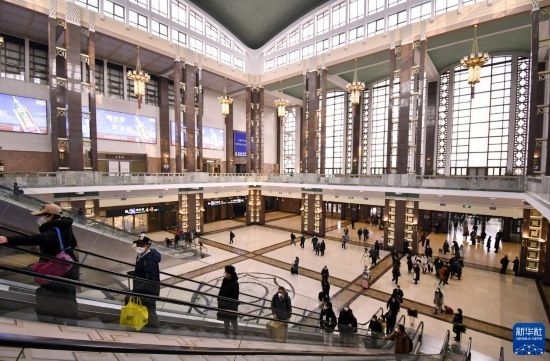 北京火車站在保持歷史原貌的前提下對(duì)候車大廳的裝飾、燈光等進(jìn)行了升級(jí)改造(2023年2月17日攝)。