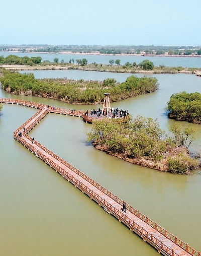 在山東黃河三角洲國家級自然保護(hù)區(qū)里,游客正在參觀。本報(bào)記者 劉發(fā)為攝