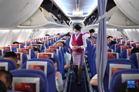 5月13日,在西安-烏魯木齊-阿什哈巴德首趟航班上,乘務(wù)員在起飛前進行客艙安全檢查。新華社記者 邵瑞 攝